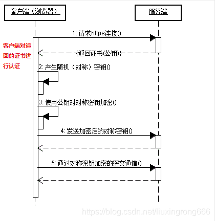 1、客户端请求建立HTTPS连接 ,2、服务器端发送数字证书给客户端,3、客户端验证数字证书确定这是正确服务器端的,并拿到服务器端的公钥,4、客户端生成一个随机数作为对称加密密钥X,5、客户端用服务器的公钥加密X发送给服务器,6、服务器接收到报文,用私钥解密报文获得对称密钥X,7、从此客户端与服务器端快乐的使用X来加密报文交流