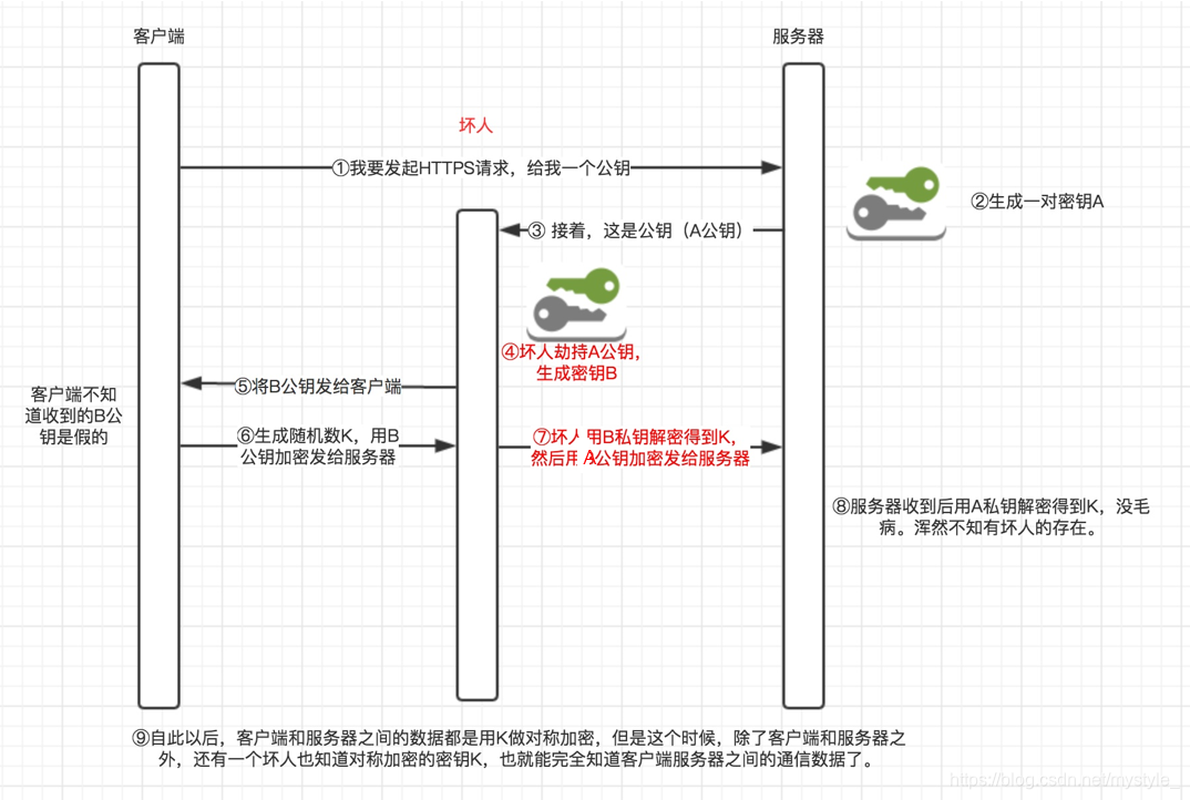 也就是说有一个中间人替换了公钥A,用自己的公钥B发给客户端,这时候客户端是用B来加密对称密钥X的,这时候中间人有私钥B可以解密获得X,此时再将X用公钥A加密发送给服务器,这时候客户端和服务器发送的内容就都被中间人解密看到了,而客户端和服务器都不知道中间人的存在