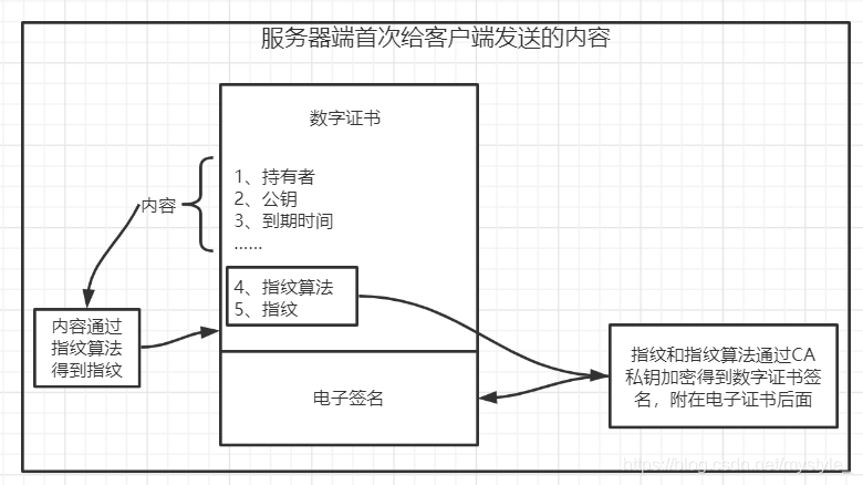 所以当客户端向服务器端请求建立连接时,服务器端首先回发送数字证书+数字签名给客户端,数字签名附在电子证书后